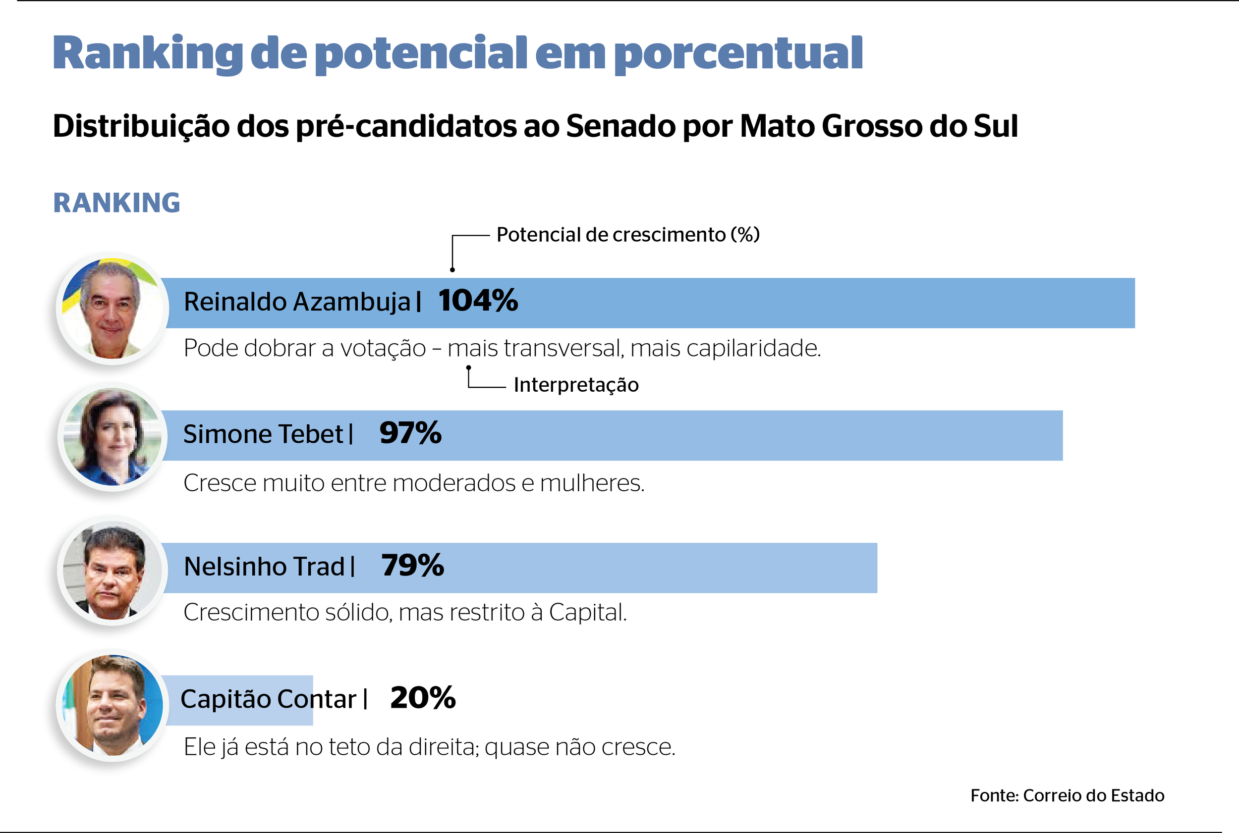 No ranking, Azambuja aparece com 104% de potencial de crescimento, podendo dobrar a votação por causa da capilaridade que detém, enquanto Tebet vem em segundo, com 97%, tendo a possibilidade de crescer entre o eleitorado feminino e o moderado.