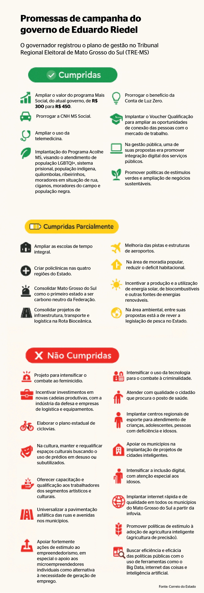 O governador Eduardo Riedel (PP) entra no último ano da sua administração estadual sem ter cumprido totalmente as 31 promessas do seu plano de governo registrado no Tribunal Regional Eleitoral de Mato Grosso do Sul (TRE-MS) nas eleições de 2022, conforme consulta feita pelo Correio do Estado.