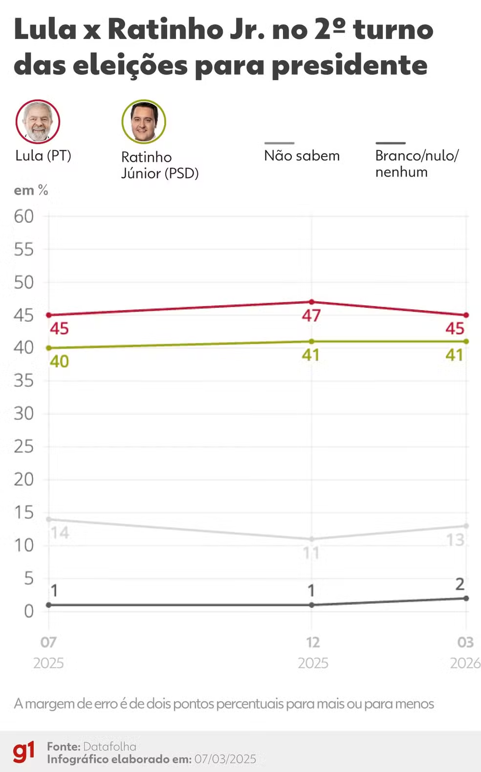 Lula (PT) - 45% (eram 47% em dezembro); Ratinho Junior (PSD) - 41% (eram 41% em dezembro); Branco/nulo/nenhum - 13% (eram 11% em dezembro); Não sabem - 2% (era 1% em dezembro).