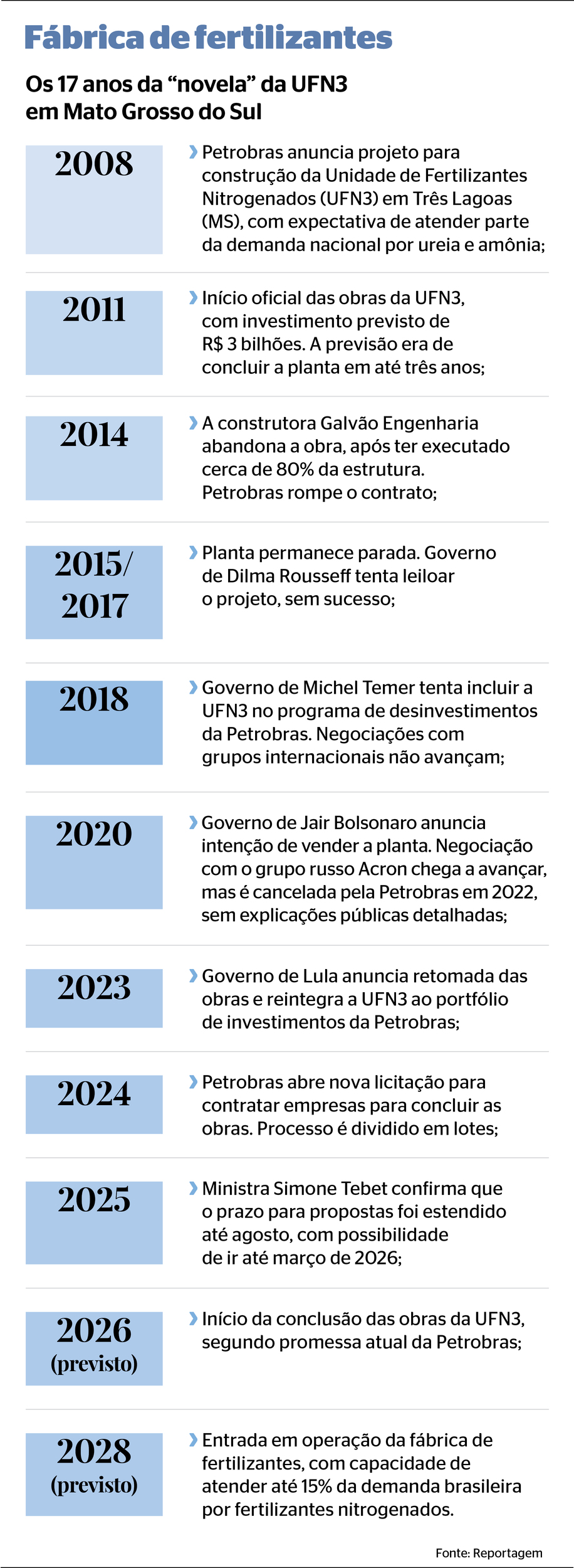 O Correio do Estado vem acompanhando a situação há anos e, em reportagem publicada em agosto, mostrou que a UFN3 teve novamente seu cronograma “empurrado”, com a previsão de funcionamento adiada para o fim da década. À época, a Petrobras informou que realizava “estudos técnicos” e “tratativas contratuais”, sem definir prazos concretos para a retomada das obras.