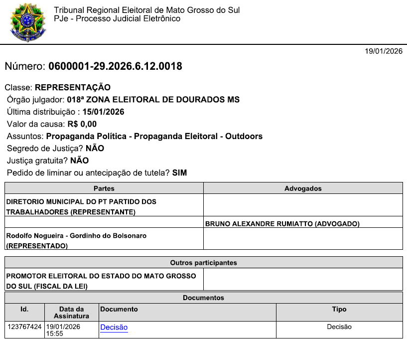 A Justiça Eleitoral determinou a retirada imediata de um outdoor considerado irregular, atribuído ao deputado federal Rodolfo Nogueira, instalado em via pública de grande circulação em Dourados (MS). A decisão liminar foi proferida pela juíza Ana Carolina Farah Borges da Silva, da 18ª Zona Eleitoral, no âmbito de representação por propaganda eleitoral irregular.